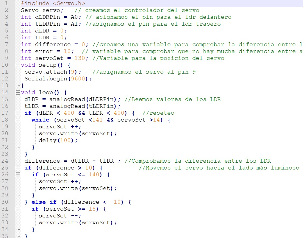 A continuación tenemos una imagen de la programación que hemos cargado en Arduino para la configuración de los movimientos del servo que mueven la placa a través de la luz que les llega a los LDR para que se oriente hacia el sol y así podamos sacar un máximo beneficio de la energía recogida con la placa solar.