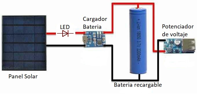 Como se puede observar en la imagen se trata de un diseño sencillo, a través del panel solar, hemos instalado un led en el circuito para evitar que la corriente retorne por el camino incorrecto, recogemos la energía que pasa por un cargador el cual nos carga la batería de litio para que con el potenciado de voltaje podamos enchufar nuestros dispositivos.