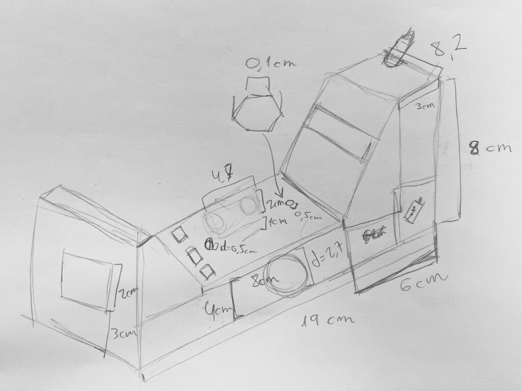 Así pues, se realizó un sketch final del prototipo del teléfono, con la colocación de los componentes y las medidas tomadas para posteriormente ser modelado.