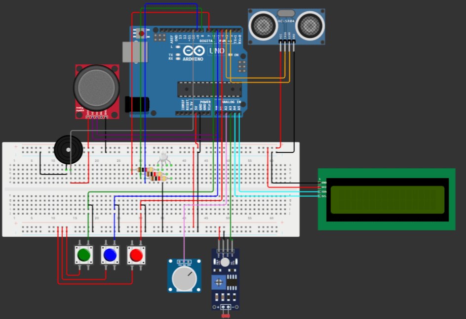 El código consiste de de dos funciones principales, setup() y loop(), y cinco funciones secundarias que gestionan las distintas órdenes del juego Joystick(), Potenciometro(), Ultrasonic(long d), RGBLed() y LuzSensor().