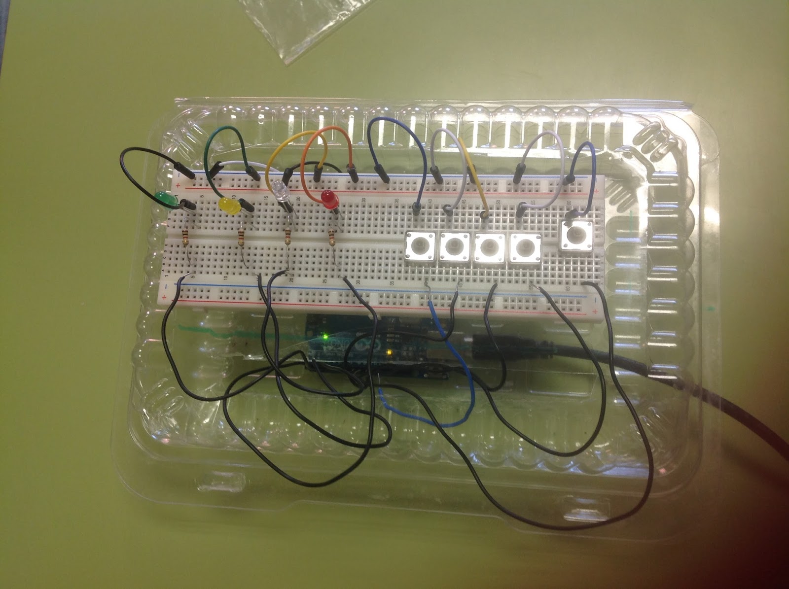 A su vez, estas resistencias las siguen unos cables que van conectados a la placa Arduino con su correspondiente señal digital; esto también pasa con los botones, que van conectados a través de un cable a la placa Arduino con su correspondiente señal digital de igual forma. Estos sirven, en el caso de los LEDs, para que la placa los pueda encender, y en el caso de los botones para enviarles la señal a la placa cuando el botón es pulsado.