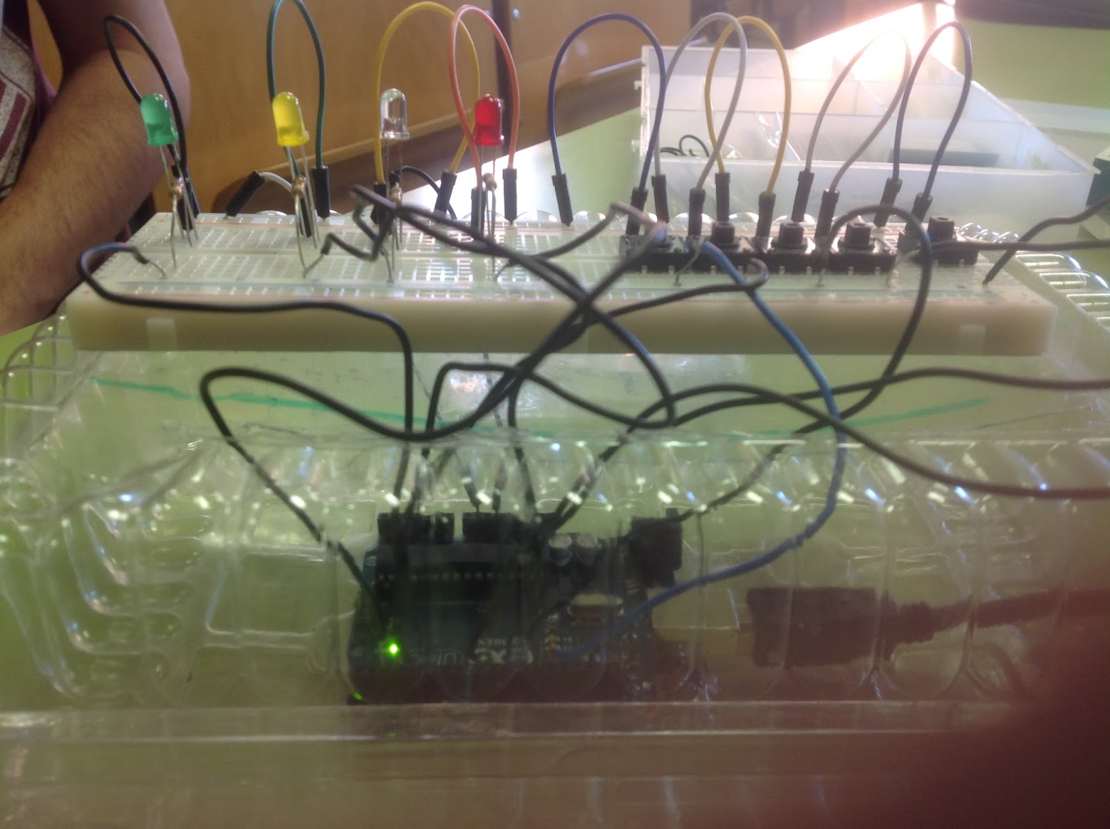 - El cable defectuoso: El equipo conectaba todos los cables correctamente, tanto en la placa de Arduino como en la placa de inserción, y dependiendo de dónde colocásemos el cable no funcionaban algunas cosas, por ejemplo, no se encendía un LED ya que el cable conectaba de la resistencia de ese LED a la placa Arduino, hasta que a un miembro del grupo se le ocurrió cambiar el cable y vimos que funcionó. Fue un problema grave que nos retrasó varios días de trabajo.