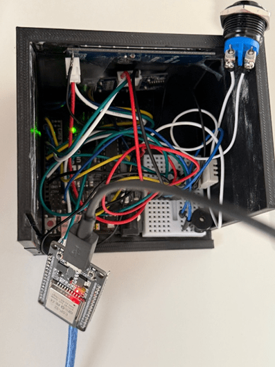 Como se puede apreciar en la imagen (Ilustración 2.- Sistema de alarma por dentro), y se ha mencionado en los materiales utilizados, hay un botón, cuyo principal objetivo es poder activar o desactivar la alarma manualmente desde dentro de la sala, en caso de haber un error en la conexión con el otro sistema.