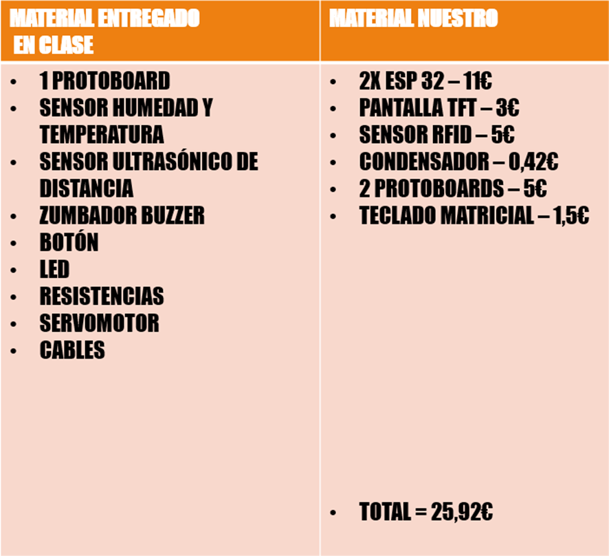 A continuación, podemos apreciar todos los materiales utilizados, escribiendo únicamente los costes de los materiales que hemos tenido que comprar, sin tener en cuenta los otorgados por la universidad.