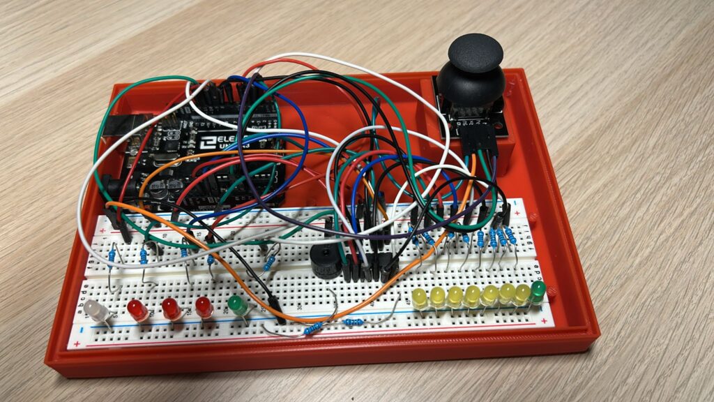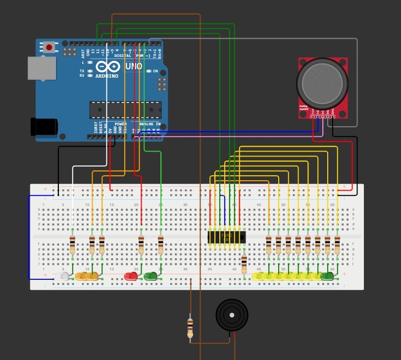 El proyecto que presento a continuación es un juego interactivo inspirado en el clásico “Escondite Inglés”, pero con una temática moderna y llena de tensión: la desactivación de una bomba de tiempo. El objetivo es simple: los jugadores deben avanzar con el joystick de la bomba mientras el semáforo se encuentra en la luz verde, pero deben quedarse completamente quietos cuando la luz roja se enciende. Si se detecta movimiento en el momento incorrecto, se contabilizaran strikes por cada error cometido y si se cometen 3 strikes, el juego terminara.