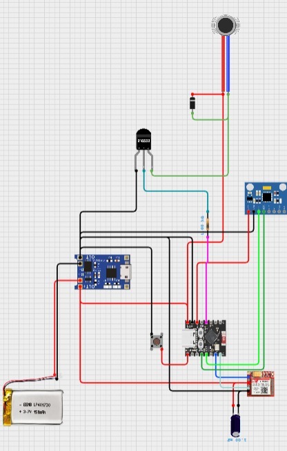 Una vez recogidos todos los componentes procedemos a la implementación sobre la Protoboard. Los elementos que vamos a incorporar son: La ESP32-C3 super mini, este va a ser el microcontrolador principal del proyecto. Esta se encargará de procesar la lectura del acelerómetro, controlar el motor vibrador, gestionar el estado del sistema y comunicarse con el módulo GSM; La SIM800L, es el responsable de enviar mensajes SMS cuando se detecta una caída o aceleración buscada; el capacitor electrolítico, actúa como estabilizador de energía; la batería es la fuente de alimentación principal del dispositivo, proporciona una tensión estable de 3.7 V y una capacidad de 1100 mAh, lo que permite alimentar la ESP32-C3, el motor vibrador y el módulo SIM, durante varias horas; El modulador de carga de Litio, permite cargar la batería Li-Po de forma segura mediane USB; el transistor NPN 2N2222, actúa como interruptor electrónico, permite controlar el motor vibrador desde la ESP32-C3, sin sobrecargar sus pines, ya que el transistor maneja corrientes superiores a las que puede suministrar directamente el microcontrolador; El motor vibrador encargado de generar la señal física de aviso mediante vibración. Se detecta cuando detecta una caída o aceleración brusca; las resistencias de 1k Ω, se utiliza para limitar la corriente que entra en la base del transistor 2N2222 desde la ESP32-C3; El diodo 1N4007 se coloca en paralelo con el motor vibrador para absorber los picos de voltaje que se generan al apagarse, evitando así daños en el transistor, reinicios en la ESP32-C3, y fallos el modulo SIM; el condensador microlítico 1000 µF, es el componente encargado de estabilizar la alimentación del circuito.