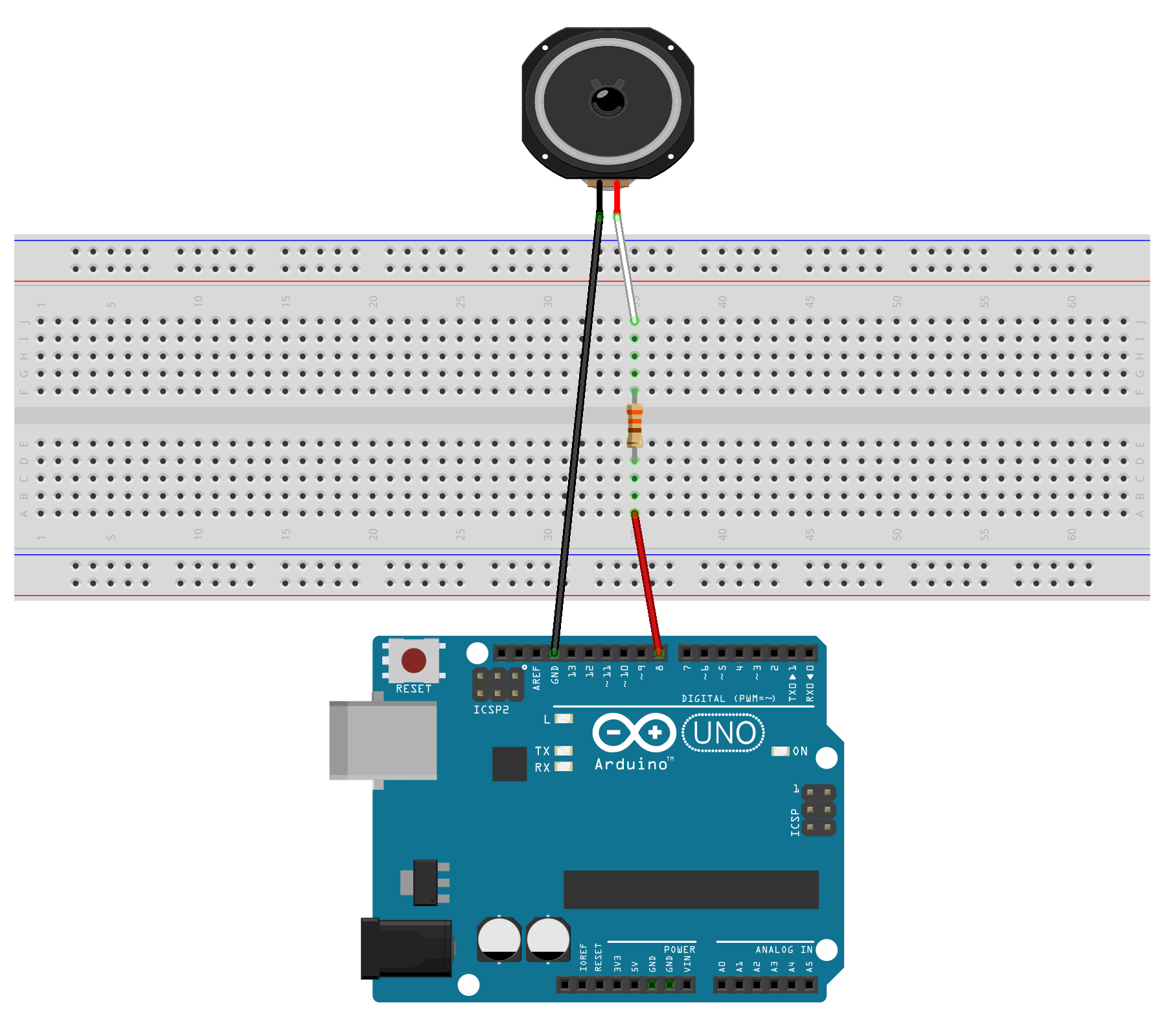 En la función setup de este código, se establece que el pin 8 del Arduino debe ser de salida y es por ahí por donde se envían cada una de las notas musicales. De ese pin se lleva un cable que pasa por la resistencia y llega hasta el altavoz. Desde el otro borne del altavoz, se conecta un cable hasta la conexión de tierra del Arduino, situada en el pin señalado como GND.